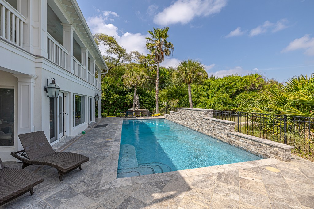 The journey to outdoor bliss begins on the first level, where you’ll find a sprawling pool area that’s destined to be your personal oasis. The large heated pool, accented with four elegant water features, beckons you to take a refreshing dip or simply lounge by its crystal-clear waters. Imagine sinking into plush lounge chairs as you listen to the soothing sound of water and feel the gentle ocean breeze on your skin.